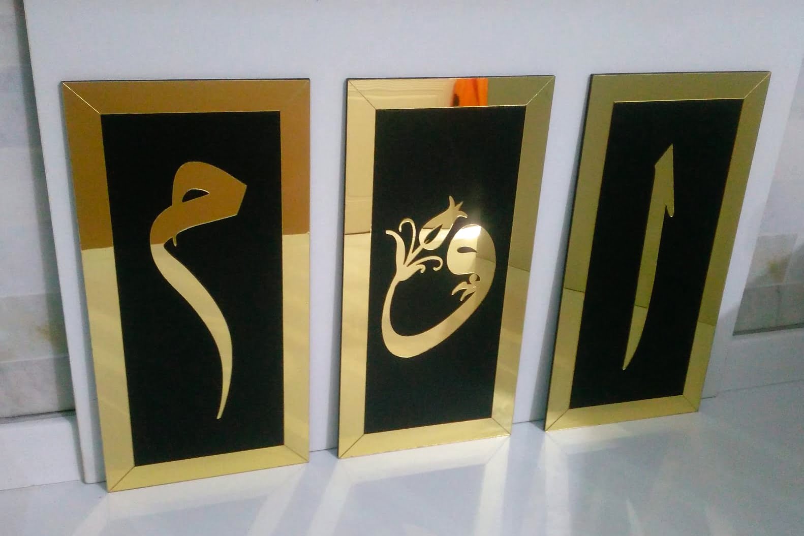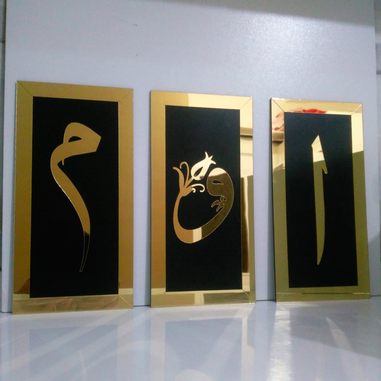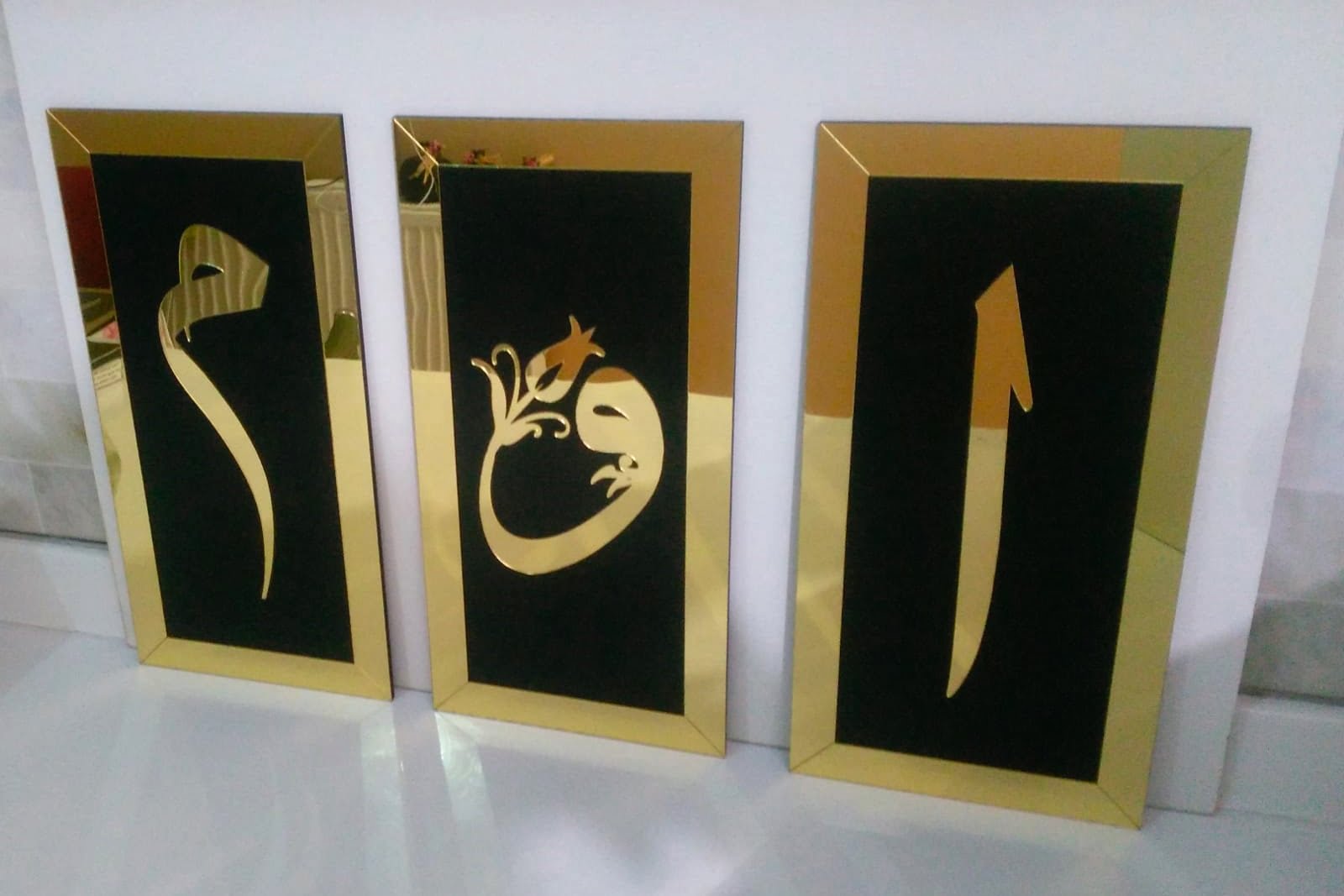 Dekoratif Siyah Üzeri Altın Aynalı Pleksi Tablo – Elif, Mim, Vav – Üçlü Set